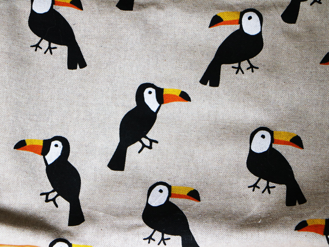 Außen: Baumwolle, Tukan auf Beige Innen: schwarzes Jeans Reißverschluss: blau oder schwarz/gold Gurt: beige